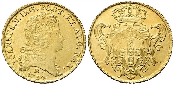 Dr. IOANNES V D G PORT ET ALG REX. Testa laureata a d.; sotto, B / 1730. Rv. Stemma coronato in cornice.