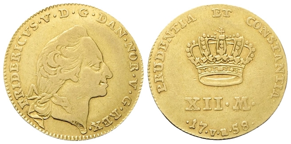 Dr. FRIDERICVS V D G DAN NOR V G REX. Testa nuda a d. Rv. PRUDENTIA ET CONSTANTIA. Grande corona con valore.