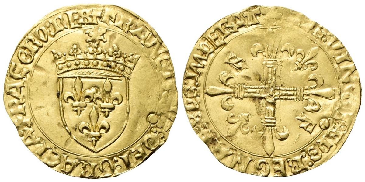 Dr. +FRANCISCVS:DEI:GRACIA:FRACORV:REX. Stemma coronato di Francia. Rv. +XPS:VINCIT:XPS:REGNAT:XPS:IMPERAT. Croce fiorata; nei quarti, gigli e F alternati.