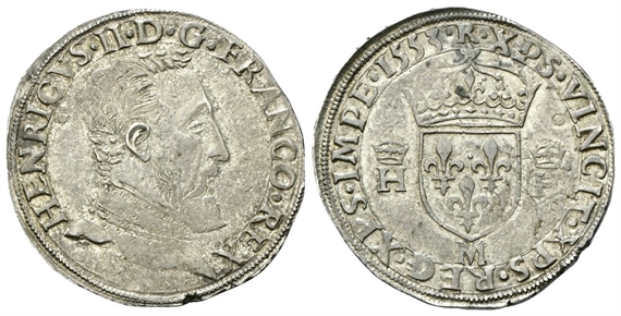 Dr. HENRICVS• II• D• G• FRANCO• REX. Busto corazzato a d. Rv. • XPS • VINCIT• XPS• REG• XPS• IMPE • 1553• R. Stemma coronato; ai lati, H coronata; sotto, M.
