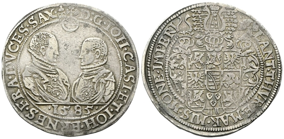 Dr. (globo crucigero)D:G •IOH :CASI• ET• IOH •ERNES• FRA• DVCES• SAX•. Busti corazzati affrontati. Rv. LANT •THVR• E• MAR •MIS• MONE• IMPERI. Stemma sormontato da cimiero.