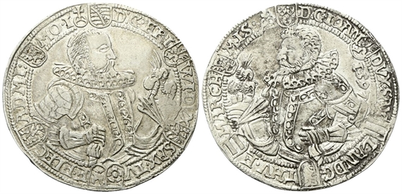 Dr. (globo crucigero) D: G• FRI (scudo) WI •DVX (scudo) SAX •TV (scudo) F• ELEC (scudo)ADMI: (scudo) MO• I. Mezzobusto corazzato a d. regge cimiero. Rv. (scudo)D: G• IOAN (scudo) DVX SAX (scudo) LANDG (scudo) THV E (scudo) MARCH (scudo) MIS•. Mezzobusto corazzato a s. regge cimiero.