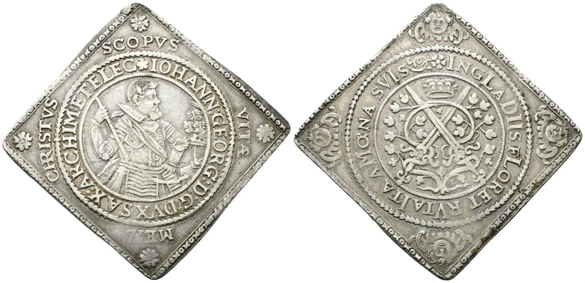 Dr. ✿IOHANN: GEORG :D :G :DVX: SAX: ARCHIM: ET: ELEC. Mezzobusto corazzato a d., regge scettro e cimiero; agli angoli, SCOPVS - VITÆ - MEÆ - CHRISTVS. Rv. ✿INGLADIIS FLORET RVTA ITA AMONA SVIS. Spade decussate sovrapposte a rami; agli angoli, teste di cherubini.