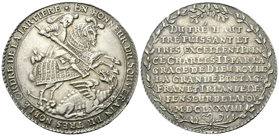Dr. ✿EN HONNEUR DU HOUVERAIN DU TRES NOBLE ORDRE DE LA IARTIERE•. San Giorgio a cavallo che uccide il drago. Rv. DU TRE’ HAUT TRE HAUT / TRE PUISSANT ET / TRES EXCELLENT PRIN / CECHARLES II PAR LA / GRACE DE DIEU ROY DE / LA GRANDE BRETAGNE / FRAN ET IRLANDE DE / FENSEUR DE LA FOY / MDCLXXVIII. Iscrizione disposta su nove righe tra due rami di alloro.