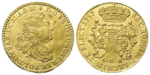 Dr. D G FRID AUGUST REX POL DUX SAX I C M A & W. Busto drappeggiato a d. Rv. SAC ROM IMP ARCHIM ET ELECT 1757. Stemma coronato.