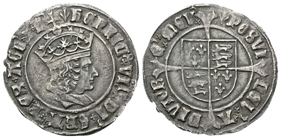 Dr. +(punta di freccia) hENRIC °+VII’ + DI’+ GRA’+ REX+AGL’+ Z + F’ . Busto coronato e drappeggiato a s. Rv. (punta di freccia) POSVI - DEV’ + A - DIVTOR - E' + MEV'. Scudo inquartato con le armi dell’Inghilterra e della Francia; sotto, due chiavi.