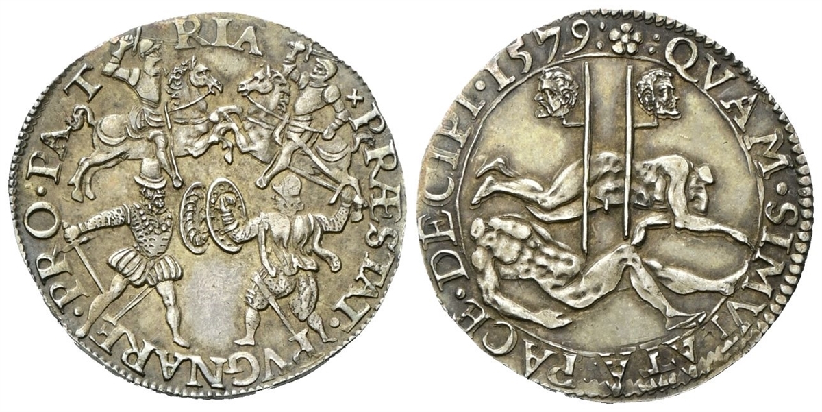 Dr. PRAESTAT• - PVGNARE - •PRO •PA - T- RIA. Combattimento tra due cavalieri e due fanti. Rv. ✿:QVAM• SIMVLATA PACE• DECIPI• 1579:. I resti dei conti di Egmont e di Hornes e le loro teste impalate.