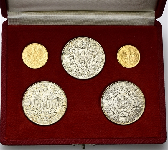 Repubblica Popolare, 1945-1989. Serie di 5 valori così composta: 20 e 10 Zlotych 1925 (Au); 100 Zlotych 1966 Prova (x2), 100 Zlotych 1966.
