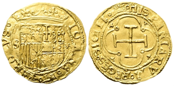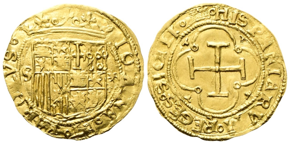 Giovanna la Pazza con il figlio Carlo, 1516-1519. Ducato, zecca di Siviglia.