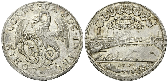 Dr. DOMINE CONSERVA NOS IN PACE. Basilisco alato con le armi di Basilea. Rv. BASILEA (in un cartiglio decorativo sotto otto stemmi). Veduta della città; in esergo, 1741 / cornucopia.