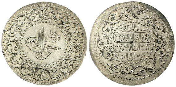 Dr. Toughra entro ghirlanda di fiori. Rv. Iscrizione araba su quattro righe entro ghirlanda di fiori.