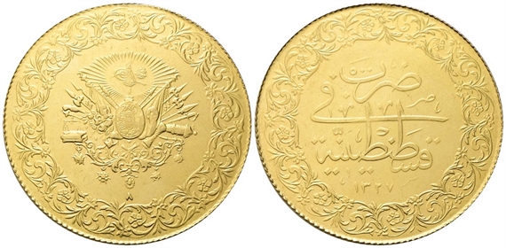 Rv. Toughra raggiante; sotto, trofeo di armi, tutto entro cornice floreale. Rv. Iscrizione in arabo su quattro righe, tutto entro cornice floreale.