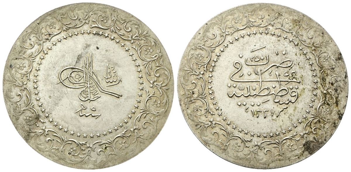 Dr. Toughra entro ghirlanda di fiori. Rv. Iscrizione araba su quattro righe entro ghirlanda di fiori.