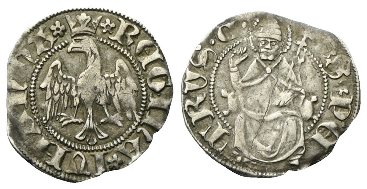 Dr. ✿ REGINA ✿IVHANNA✿. Aquila stante verso s., con ali spiegate. Rv. •S ✿PE - TRVS• D•. Il Santo benedicente regge lunga croce.