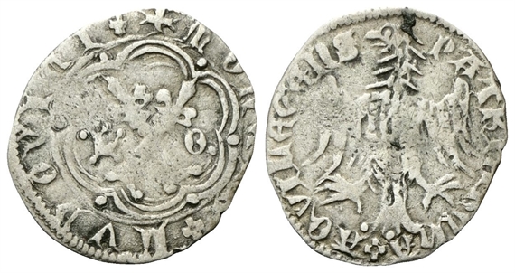 Dr. MONETA ✤LVDOVICI (giglio). Due scettri gigliati decussati, ai lati, L - O. Rv. PATRIARChA ✤AQVILEGENS. Aquila spiegata.