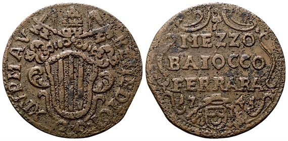 Dr. BENEDICT - XIV P M A V. Stemma oblungo tra volute, sormontato da chiavi decussate e triregno. Rv. MEZZO / BAIOCCO / FERRARA. Iscrizione su tre righe; sotto, stemma Paolucci a cuore, tutto entro rami di palma.