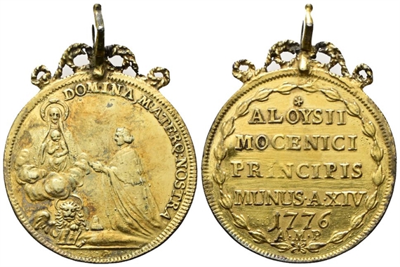 Dr. DOMINA MATERQ:NOSTRA. Il doge genuflesso verso s., in atto di pregare davanti all’immagine della Beata Vergine con il Bambino sulle nubi; a s., leone di S. Marco con il Libro e il corno dogale. Rv. ★/ ALOYSII / MOCENICI / PRINCIPIS / MUNUS •A• XIV / 1776 / A•M•P (Angelo Maria Priuli massaro). Iscrizione disposta su sette righe entro corona d’alloro.