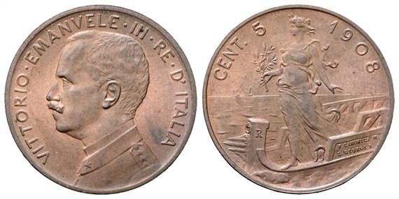 Vittorio Emanuele III, 1900-1943. 5 Centesimi 1908 Roma, Italia su prora.