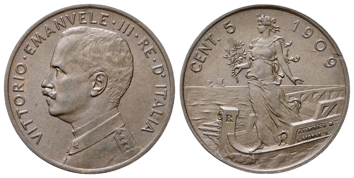 Vittorio Emanuele III, 1900-1943. 5 Centesimi 1909 Roma, Italia su prora.