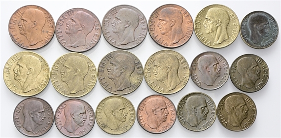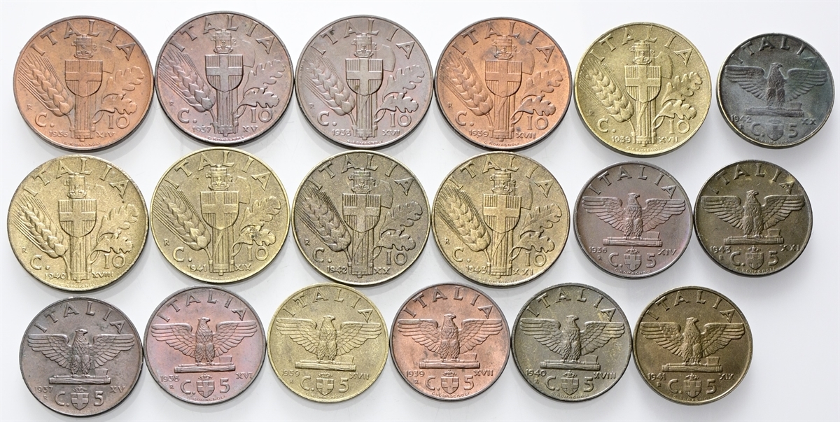 Vittorio Emanuele III, 1900-1943. Lotto composto da 18 monete: 5 centesimi e 10 Centesimi Impero anni dal 1936 al 1943.