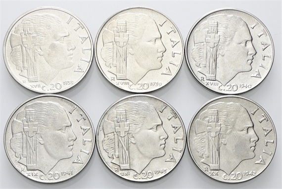 Vittorio Emanuele III, 1900-1943. Lotto di n. 6 esemplari da 20 Centesimi Impero datati 1939-1943.