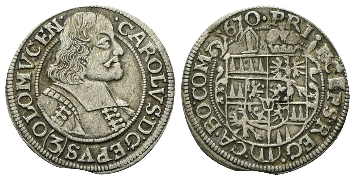 Dr. CAROLVS D G EPVS OLOMVCENS. Busto a d. Rv. CA BO COM- 1670 PRI - NCEPS REG. Stemma sormontato da tiara e da corona.