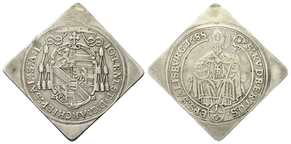 Dr. IO ERNST 9 D R ARCHIEP SAL S A L. Stemma con galero. Rv. S RVDBERTUS - EPS SALISBVRG 1688. San Ruperto, frontale, seduto su trono