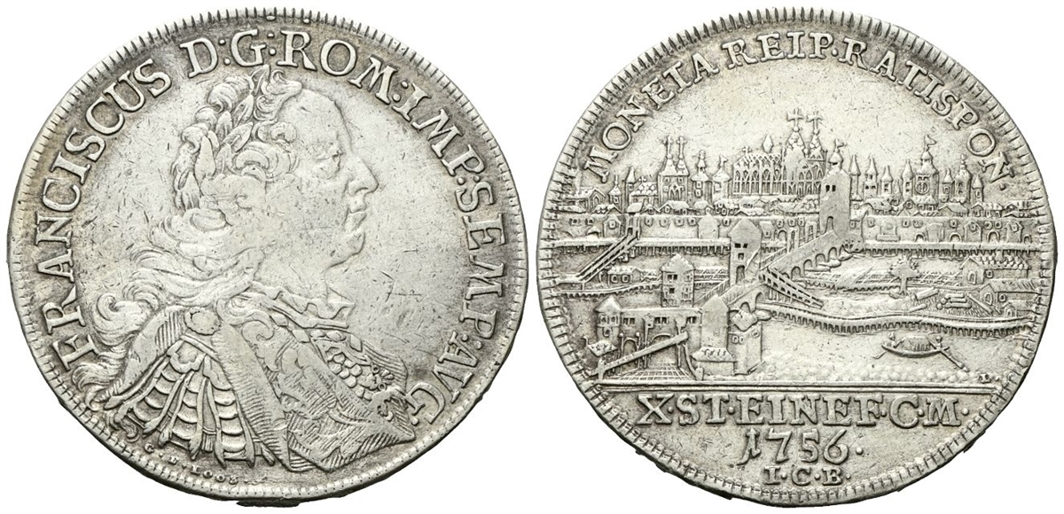 Dr. FRANCISCUS D G ROM IMP SEMP AVG. Busto corazzato a d. Rv. MONETA REIP RATISPON•. Veduta della città di Ratisbona; in esergo, X• ST• EINE F• C •M• / 1756•.