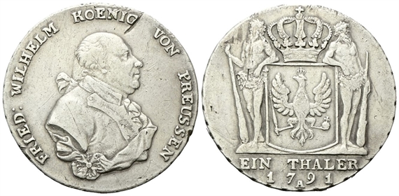 Dr. FRIED WILHELM KOENIG VON PREUSSEN. Busto a d. Rv. Stemma coronato; ai lati, due primitivi; in esergo, EIN THALER / 1791.