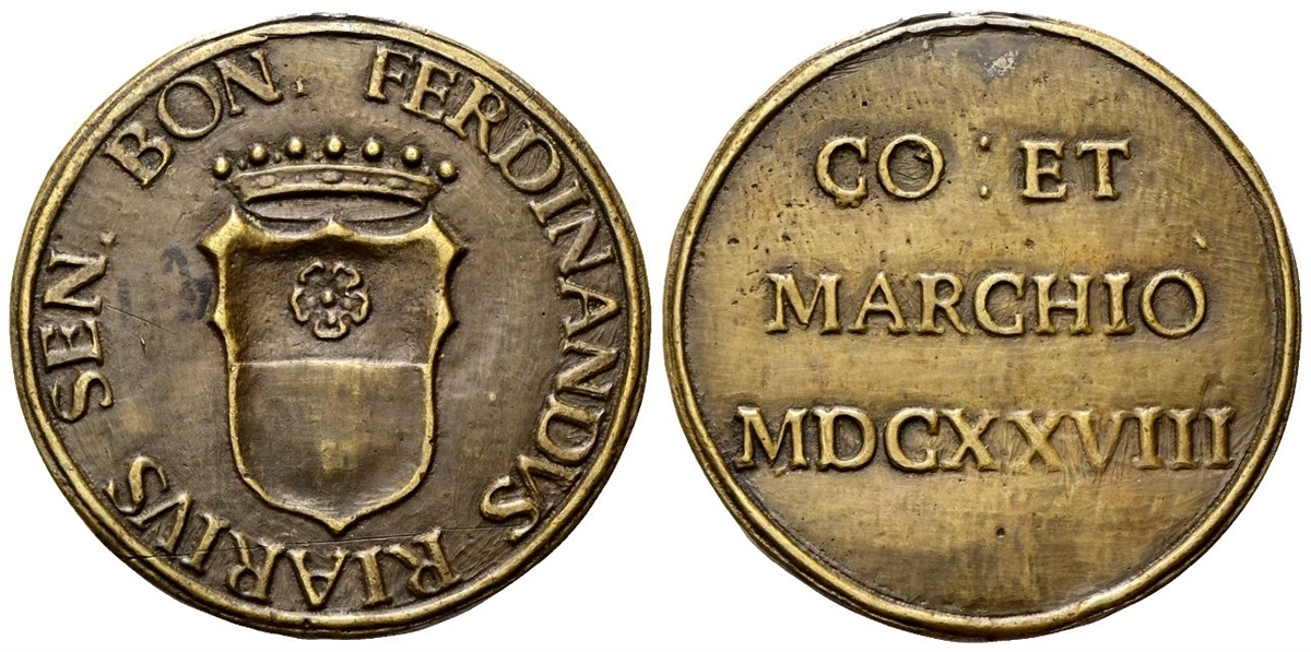 Dr. FERDINANDVS RIARIVS SEN BON. Stemma coronato. Rv. CO ET / MARCHIO / MDCXXVIII. Iscrizione disposta su tre righe.