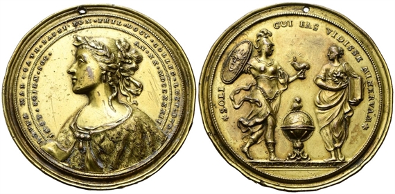 Dr. LAVRA MAR GATH BASSI BON PHIL DOCT COLLECT PVB. Busto a s. con corona d'alloro e manto di ermellino; a s., INST SCIEN SOC; a d., AN XX MDCCXXXII. Rv. SOLI - CUI FAS VIDISSE MINERVAM. Giovane donna in piedi (Laura Bassi) mentre regge libro e la corona dalloro, al centro mappamondo (simbolo della filosofia naturale) sormontato da civetta, guarda Minerva, che le porge una lucerna e regge scudo con la