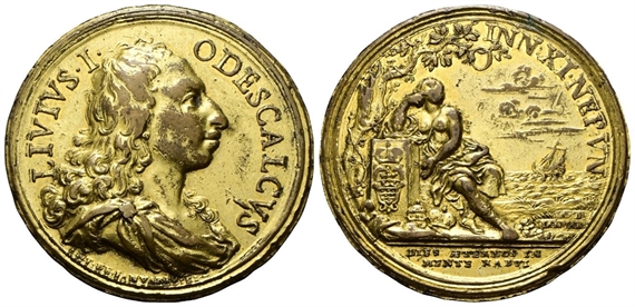 Dr. LIVIVS I - ODESCALCVS. Busto paludato a d. con lunga capigliatura ricadente sulle spalle; sotto la troncatura del busto, ANT DE IANVARIO F. Rv. INN XI NEP VN. Figura muliebre seduta verso s., si appoggia a un cippo su cui è scolpito lo stemma di famiglia; sull’albero, serpe che si morde la coda ed in basso ai piedi della donna elmo, tiara e cappello cardinalizio; sullo sfondo, una nave nel ma
