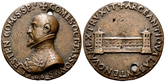 Dr. COMES OCT TASSONVS - ESTEN COM S SP. Busto a s., testa nuda, indossa corazza; sul petto, l’aquila Estense e la croce di Gerusalemme; sotto, 1606. Rv. ARCE ANTIQVA LABENTE NOVAM EXTRVXIT. Prospetto della fortezza d’Este ricostruita, fiancheggiata da due torrioni.