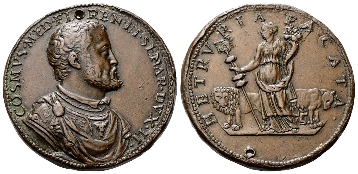 Dr. COSMVS MED FLO[RE]N ET SENAR DVX II. Busto a d. con corazza e mantello. Rv. HETRVRIA - PACATA. Figura femminile stante tra un leone e una lupa, tiene stendardo e cornucopia.
