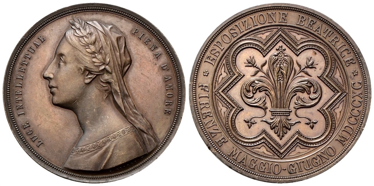 Dr. LUCE INTELLETTUAL - PIENA D’AMORE. Busto di Beatrice a s.; sulla troncatura della spalla, L GIORGI F. Rv. ESPOSIZIONE BEATRICE / FIRENZE MAGGIO GIUGNO MDCCCX. Giglio di Firenze entro cornice quadriloba.