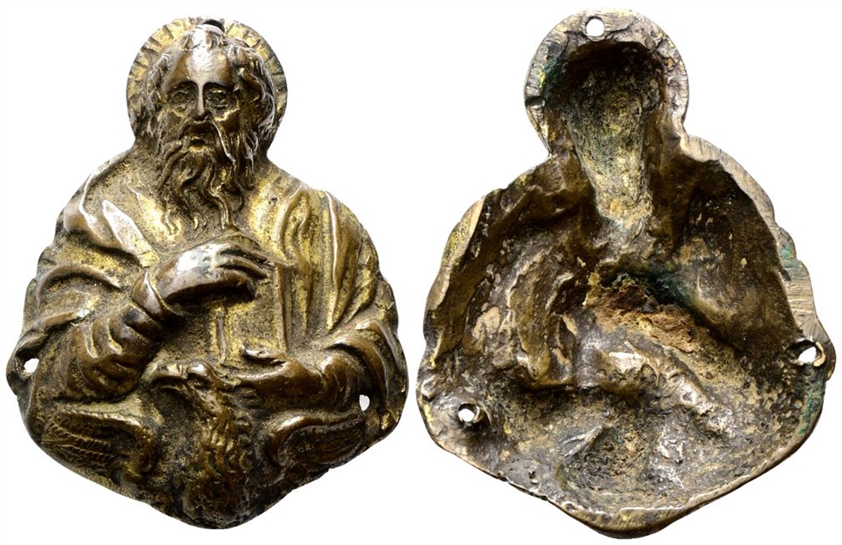 Dr. Mezzo busto di San Giovanni, testa leggermente a s., con mantello, regge entrambe le mani il Vangelo; sotto, l’aquila.