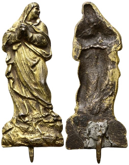Dr. Figura intera della Vergine stante, testa a d., con mantello, ha le mani giunte all’altezza del petto in segno di preghiera. Rv. Perno di fissaggio.