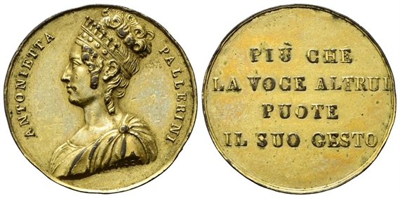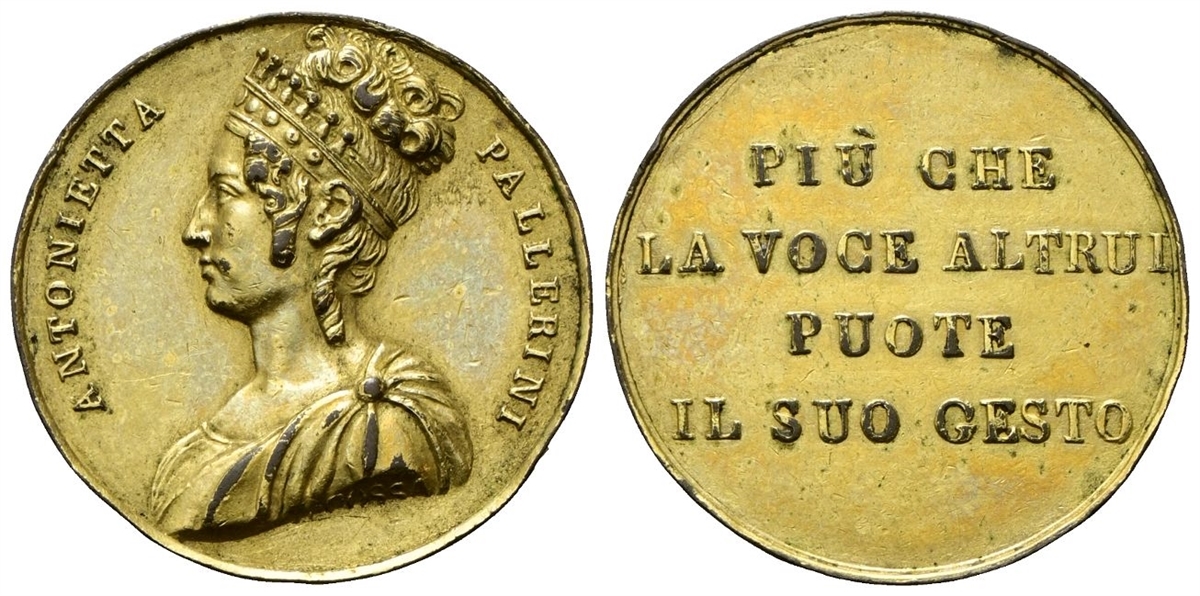 Dr. ANTONIETTA - PALLERINI. Busto drappeggiato a s.; sul taglio del busto, L COSSA. Rv. PIÙ CHE / LA VOCE ALTRUI / PUOTE / IL SUO GESTO. Iscrizione disposta su quattro righe.