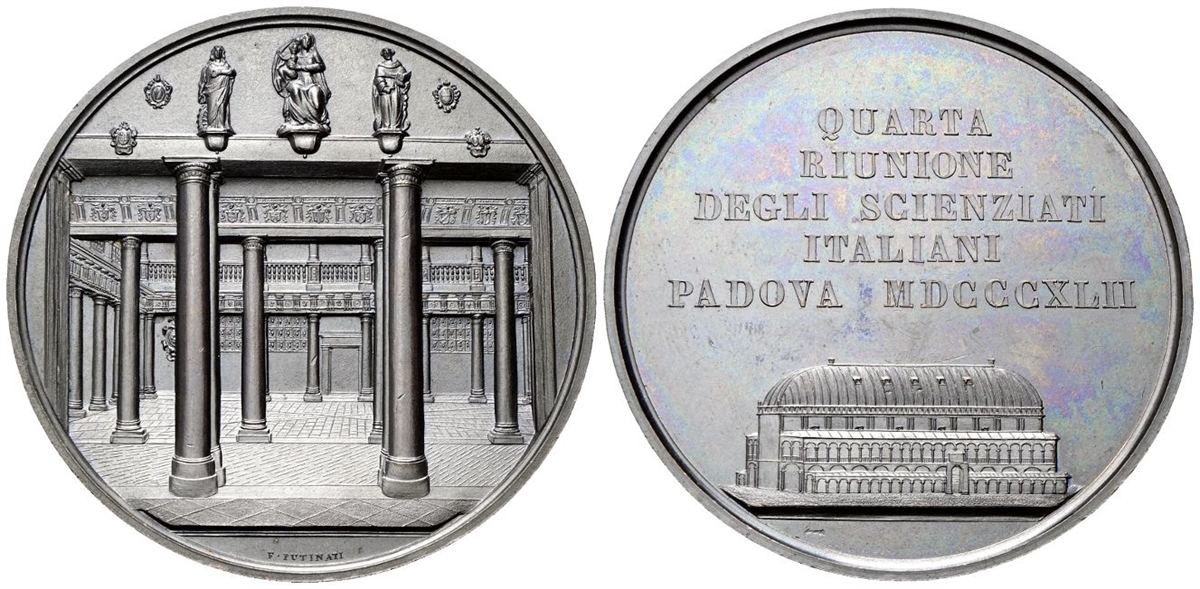 Dr. Cortile interno di Palazzo del Bo; in esergo, F PUTINATI. Rv. QUARTA / RIUNIONE / DEGLI SCIENZIATI / ITALIANI / PADOVA / MDCCCXLII. Il Palazzo della Regione.