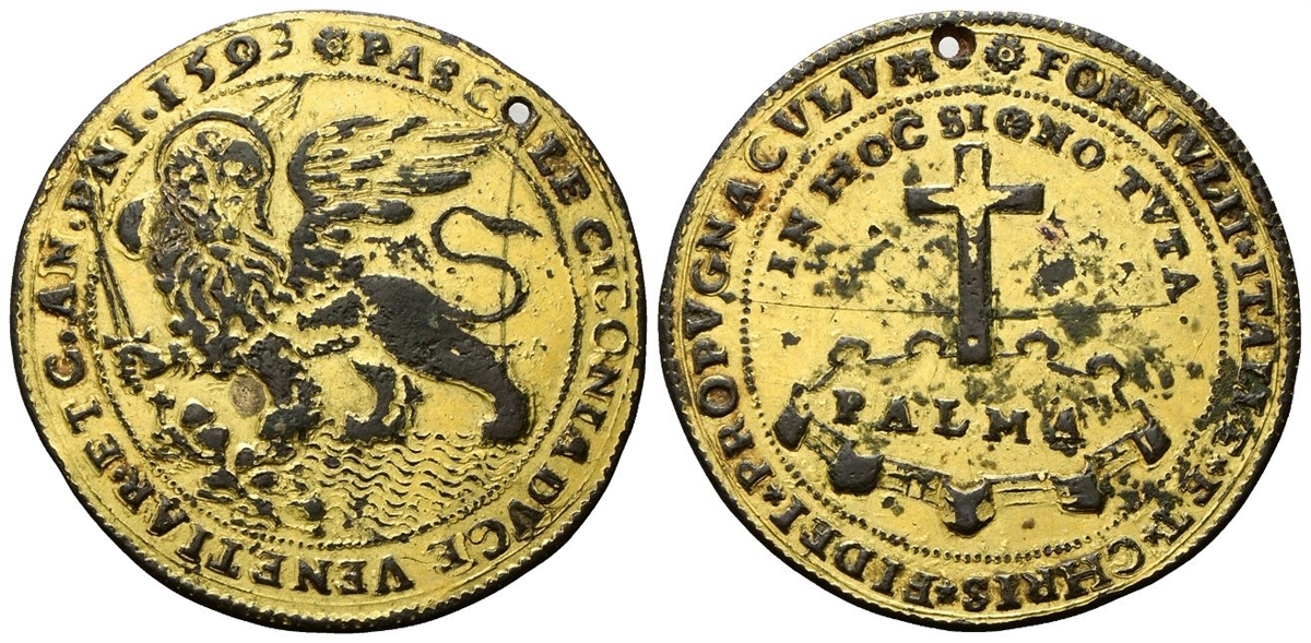 Dr. PASCALE CICONIA - DVCE VENETIAR ET C AN - DNI 1593. Leone di San Marco verso s., con spada. Rv. FORIIVLII ITALIAE ET CHRIS FIDEI PROPVGNACVLVM. Grande Croce sulla fortezza di Palmanova; sopra, IN HOC SIGNO TVTA.