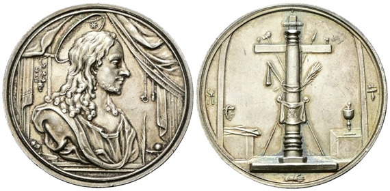 Dr. Busto di Cristo a d. con lunghi capelli sulle spalle, tra drappeggi e simbologie cristiane. Rv. La Colonna con il velo della Veronica, la palma e lo staffile sovrapposta alla Croce; attorno, simboli della Passione di Cristo.