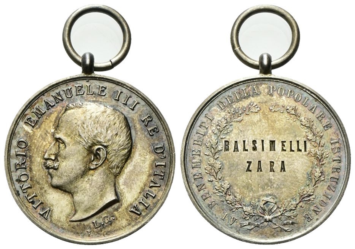 Dr. VITTORIO EMANUELE III RE D’ITALIA. Testa nuda a s.; sotto il collo, L G. Rv. AI BENEMERENTI DELLA POPOLARE ISTRUZIONE. BALSINELLI / ZARA. Iscrizione (incisa) disposta su due righe, tra due rami di quercia.