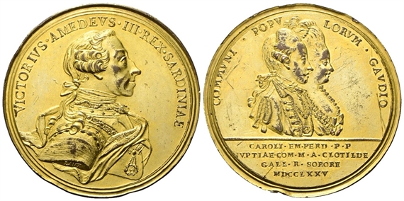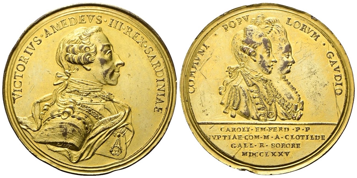 Dr. VICTORIVS AMEDEVS III REX SARDINIAE. Busto a d. con parrucca, in armatura con cravatta e Collare della SS. Annunziata; sulla troncatura del braccio, LAVY. Rv. COMMVNI POPV - LORVM GAVDIO. Busti accollati a d. di Carlo Emanuele di Savoia e di Maria Clotilde Saveria di Francia; in esergo, CAROLI EM FERD P P / NVPTIAE COM M A CLOTILDE / GALL R SORORE / MDCCLXXV.