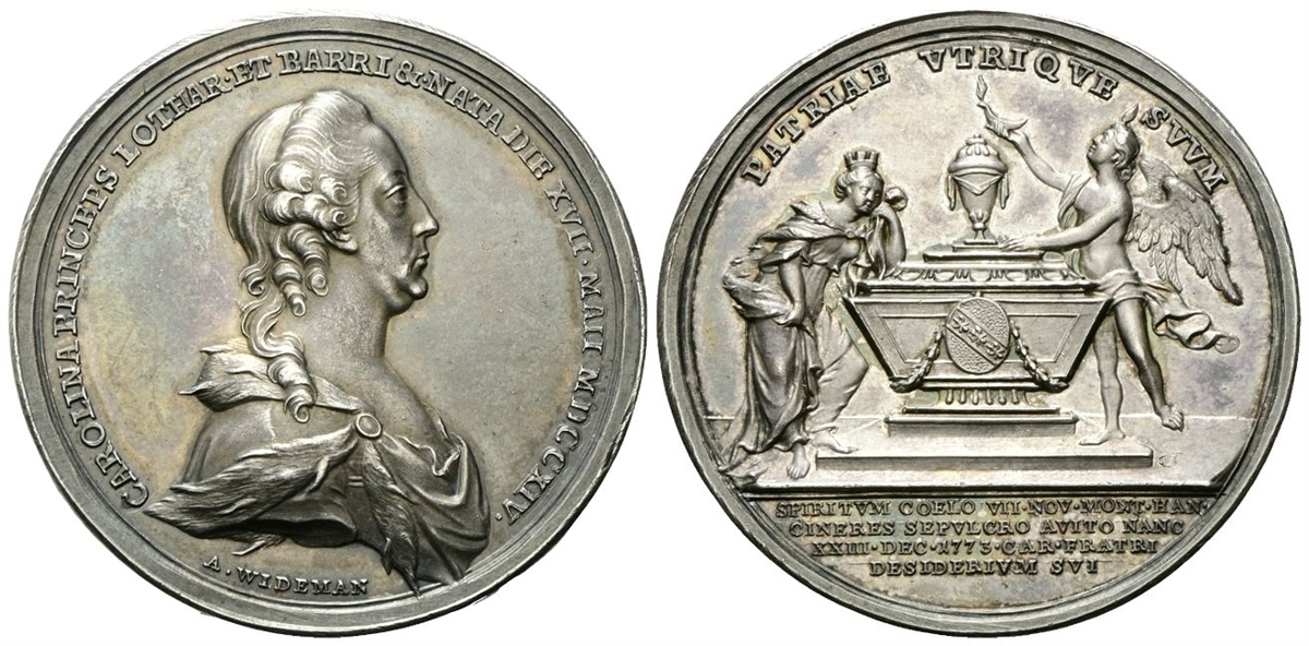 Dr. CAROLINA PRINCEPS LOTHAR ET BARRI & NATA DIE XVII MAII MDCCXIV. Busto drappeggiato a d.; sotto, A WIDEMAN. Rv. PATRIAE VTRIQVE SVVM. La città di Nancy in lutto davanti alla tomba della principessa; a d., un genio che regge una lampada; in esergo, SPIRITVM COELO VII NOV MONT HAN / CINERES SEPVLCRO AVITO NANC / XXIII DEC 1773 CAR FRATRI / DESIDERIVM SVI.