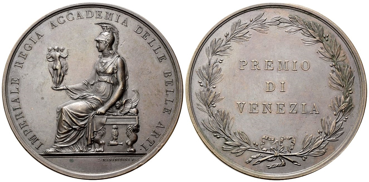 Dr. IMPERIALE REGIA ACCADEMIA DELLE BELLE ARTI. Atene seduta verso s. regge con la mano s. le Tre Grazie; in esergo, L MANFREDINI F. Rv. PREMIO / DI / VENEZIA. Iscrizione disposta su tre righe tra rami di lauro.