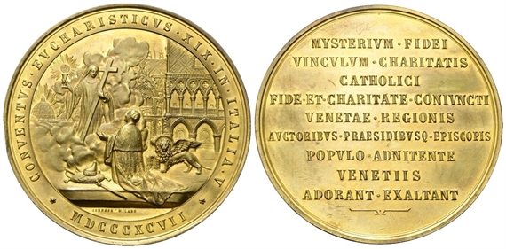 Dr. CONVENTVS EVCARISTICVS XIX IN ITALIA V HABITVS VENETIIS AN MDCCCXCVII. Il doge genuflesso davanti a una Santa che reca Crocefisso e Calice con ostia raggiante; ai lati, corno dogale su cuscino e Leone di San Marco; sullo sfondo, angolo di Palazzo Duc Rv. MYSTERIVM FIDEI / VINCVLVM CHARITATIS / CATHOLICI / FIDE ET CHARITATE CONIVNCTI / VENETAE REGIONIS / AVCTORIBVS PRAESIDIBVSQ EPISCOPIS / POPVLO ADNITENTE / VENETIIS / ADORANT EXALTANT. Iscrizione disposta su nove righe.