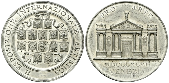 Dr. II ESPOSIZIONE INTERNAZIONALE ARTISTICA. Stemmi di 14 nazioni legati da nastro. Rv. PRO - ARTE. Prospetto del padiglione centrale dell’esposizione.