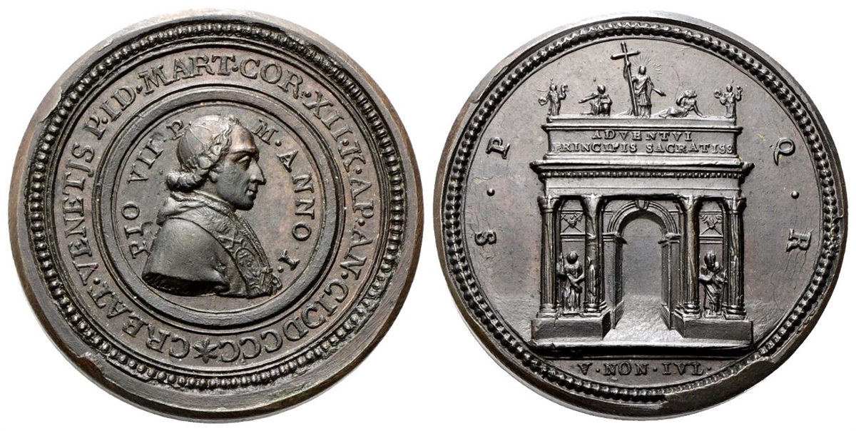 Dr. CREAT VENETJIS P ID MART COR XII K AP AN MDCCC / PIO VII P M ANNO I. Busto a d., con zucchetto, mozzetta e stola; sotto la troncatura del busto, MERCANDETTI. Rv. S P - Q R. Arco trionfale construito in Piazza del Popolo; sull’architrave, ADVENTVI / PRINCIPIS SACRATISS; in esergo, V NON IVL.