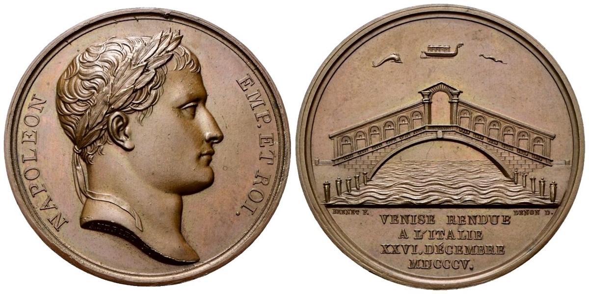 Dr. NAPOLEON EMP - ET ROI. Testa laureata a d.; sulla troncatura del collo, DROZ FECIT; sotto, DENON DIREX / MDCCCVI. Rv. Veduta del ponte di Rialto; in esergo, VENISE RENDUE / A L’ITALIE / XXVI