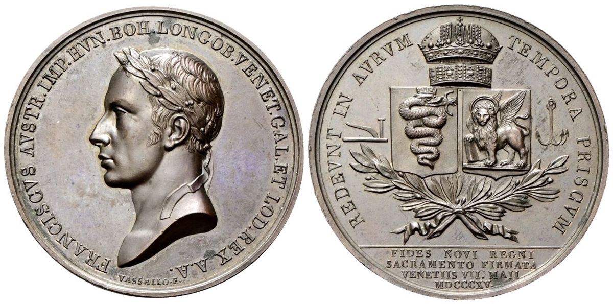 Dr. FRANCISCVS AVSTR IMP HVN BOH LONGOB VENET GAL ET LOD REX A A. Testa laureata a s.; sotto la troncatura del collo, VASSALLO F. Rv. REDEVNT IN AVRVM - TEMPORA PRISCVM. Stemma di Milano e Venezia sormontato da corona ferrea e corona imperiale; ai lati, aratro e ancora, tutto su due rami di quercia incrociati e legati alla base; esergo, FIDES NOVI REGNI / SACRAMENTO FIRMATA / VENETI